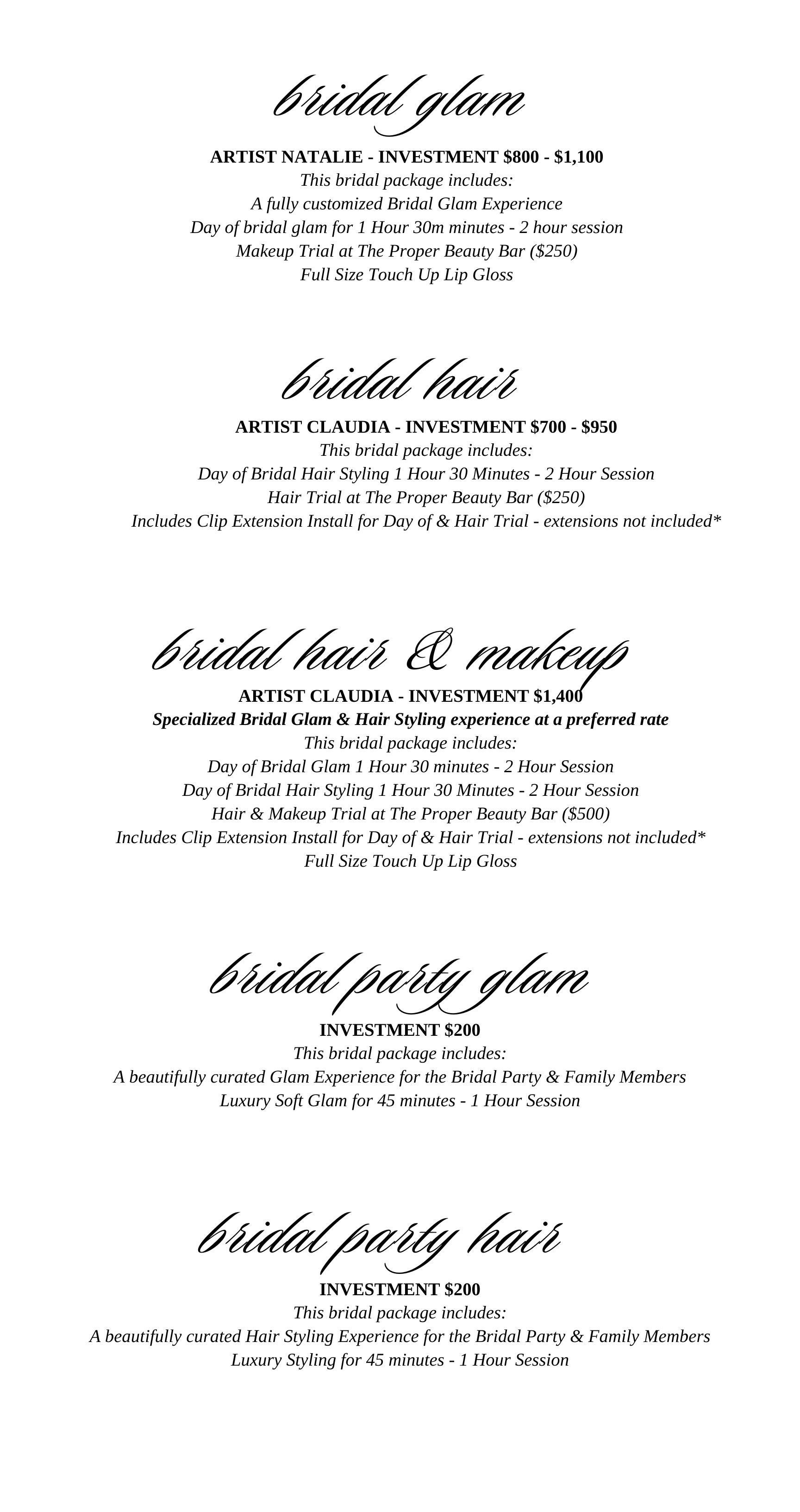 We do not require a minimum for booking, the Bride’s hair & or makeup service is the only requirement to book. We do not do “Bridal Party Only” services.